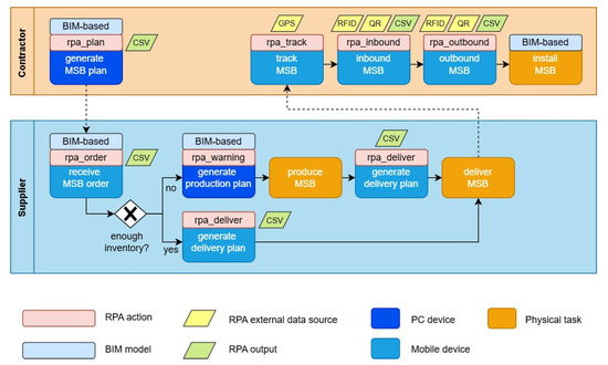 All manual operations can be performed using mobile devices, except MSB planning and production planning, which are usually integrated into existing PC systems. The overall workflow is deployed on the blockchain network, and all tasks and gateway decisions will be recorded into transactions to ensure traceability. The automation mechanism of blockchain-enabled smart contracts has been introduced in our previous study [27]. Meanwhile, the status of internal task RPA actions can also be recorded and ensured via the blockchain network.