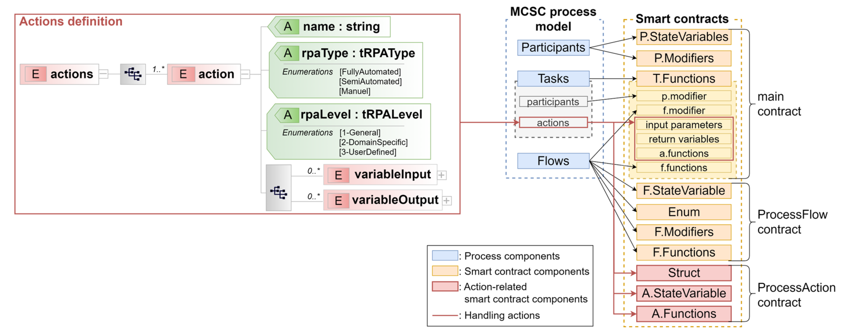 - Smart contract process: This section displays the structured process logic defined by the smart contract, including MCSC tasks, decision points, and information flows, providing a visual representation of the automated workflow. The basic coordination unit in the process is an MSB, which serves as the token passed along task-to-task transitions throughout the workflow.