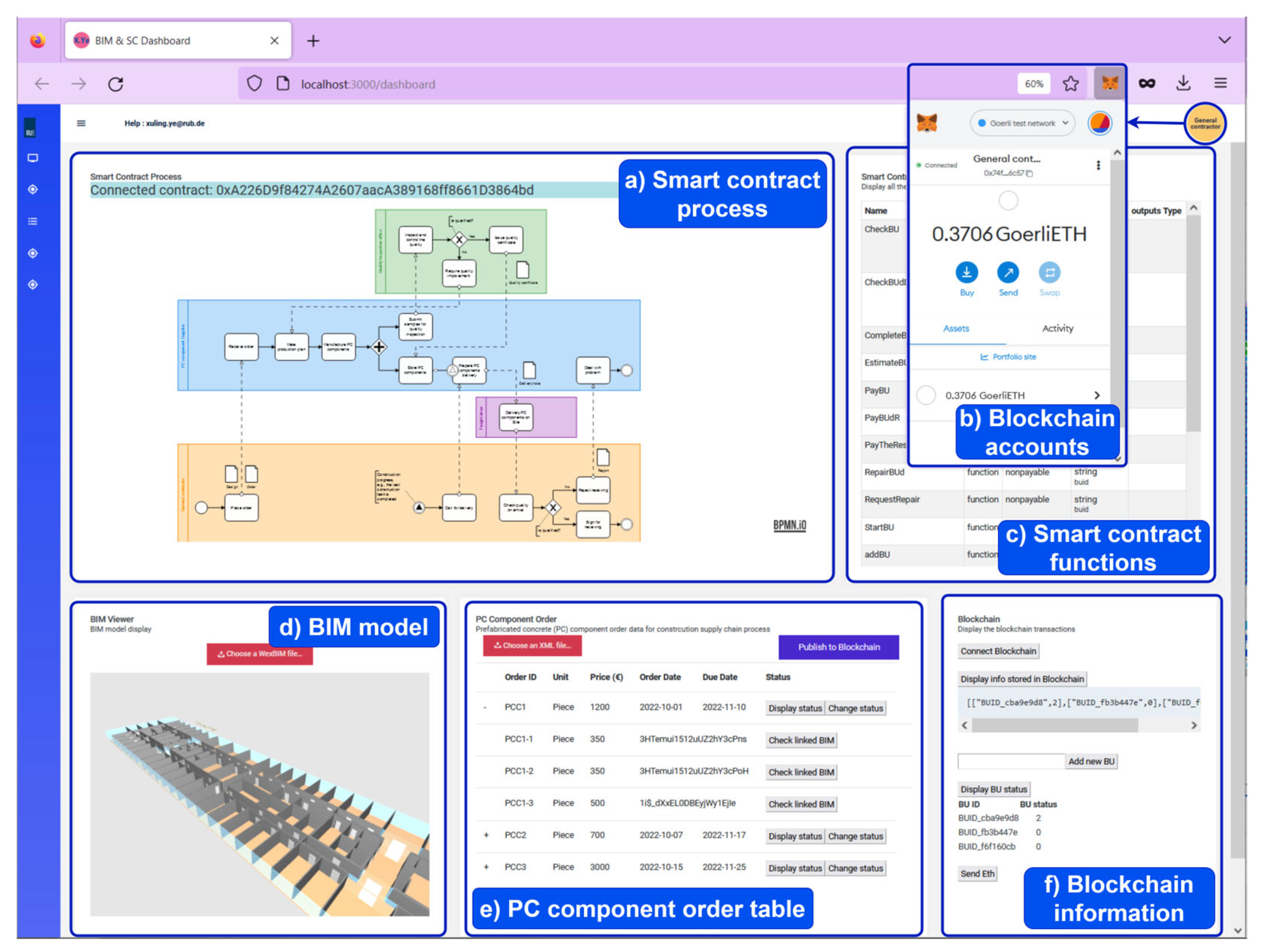 - Blockchain information: This section displays the status of blockchain interactions, including transaction hashes and event logs, ensuring transparency and traceability of recorded actions. In this demo system, order and MSB information are mandatorily recorded on-chain, while BIM models and process status are optionally recorded on-chain.