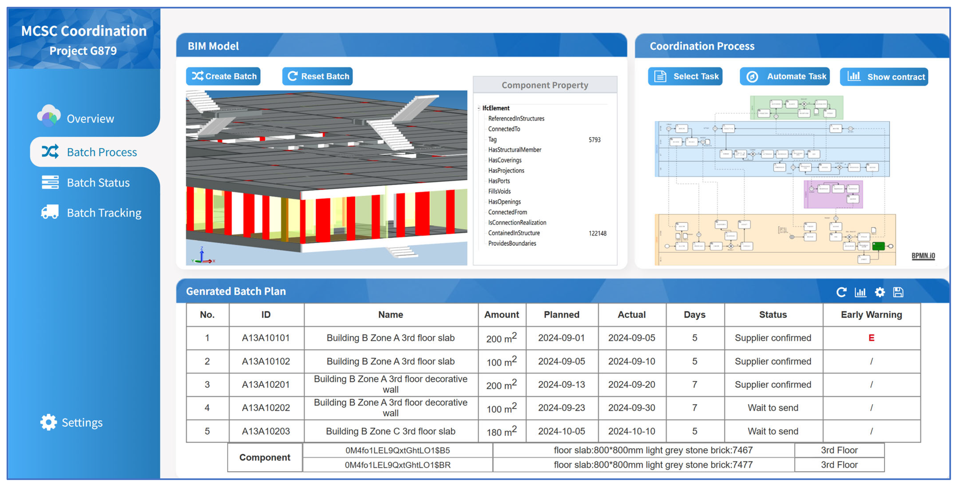 - Component order table: This table manages the tracking of MC component orders, detailing order IDs, product types, dimensions, delivery times, and status. It allows users to publish relevant data to the blockchain and link it to corresponding BIM elements. The MSBs are also linked with an order using the batch-to-order (one or multiple MSB IDs match one order ID) method.