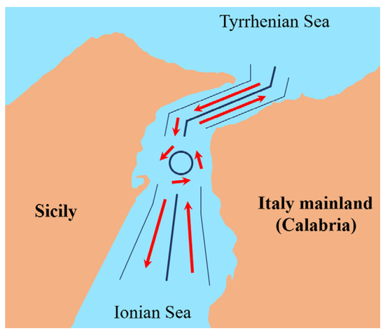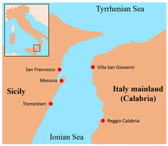 The Strait of Messina is a stretch of sea interposed between peninsular Italy and the major Italian island, Sicily. The strait connects the Ionian Sea, to the south, with the Tyrrhenian Sea, to the north, going to lap the cities of Messina and Reggio Calabria. It is funnel-shaped with the narrowest part in the north, with a minimum width of about 3150 m. In the Strait of Messina there are five harbors: three in Sicily and two in Italy’s mainland—Port of Messina, dock of Tremestieri, the dock of San Francesco in Sicily and port of Reggio Calabria, and port of Villa San Giovanni in Italy mainland. The harbors are shown in Figure 1.