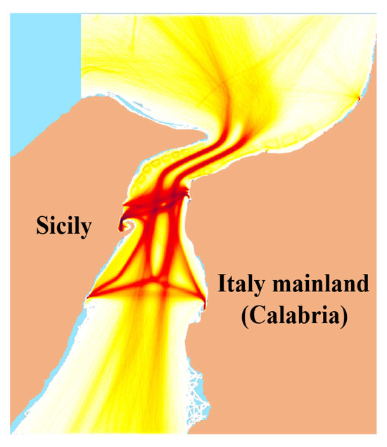 As reported in Table 3, there are four types of information transmitted by a ship that uses the AIS system: static information, dynamic information, voyage-related information and safety-related information. The static information is fixed during the installation of the system on board, and it is changed only in case of a change in the Maritime Service Identity of the ship, change in the position of EPFS, or in case of conversion of the ship type in another way. The dynamic information is automatically updated during the voyage, only the navigational status is manually entered and changed as necessary. The voyage-related information is manually entered and updated during the voyage. The transmission of the data can occur with a specific antenna taking advantage of Very High Frequency (VHF) channels. Usually, the transmission of the AIS data takes place via two specific channels, but it is always possible for the unit to switch the transmission into other channels in case of necessity. In the Strait of Messina, the AIS system is mandatory for all vessels over 300 GT and for all the passenger ships (Messina VTS User’s Manual 2015). The transmission of the data can be conducted between ships and also between ships and shore stations. This last condition offers the port authority the possibility to manage maritime traffic. The VTS office stores these data in a daily-recorded database. Figure 3 shows the geographical limits of the VTS area in the Strait of Messina and Figure 4 the density map of AIS traces in VTS zone of the Strait of Messina. AIS data related to this density map covers a period of 12 months (June 2018–May 2019).