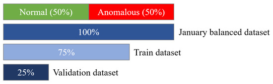 It is useful to remember that all AIS data in each dataset were labelled and, for convenience, given the binary classification, the class Anomalous and the class Normal will be called, from now on, respectively, Positive Class (PC) and Negative Class (NC). The January balanced dataset was used to train and validate the model, and it has been divided into two datasets (train and validation dataset). These datasets contain 75% and 25% of the January balanced dataset respectively (Figure 5).