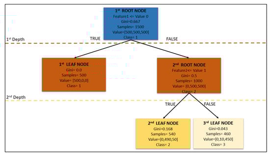 It is possible to see an example of the final structure, and so the typical nodes used by the model to make predictions. Thanks to this structure the model decides which class the input instance belongs to. In particular, Figure 6 shows a model with a maximum depth of 2, trained on a dataset with 1500 instances. Each instance has only two features (k1 and k2) and it can belong to one of three classes labelled (“1”, “2”, and “3”, just for a better understanding). The nodes usually involved in the decision tree are root nodes or leaf nodes. The root nodes usually have a splitting criterion and so consequently child nodes, the leaf nodes have no split criteria and so do not split any further. Each node has several parameters: splitting criteria if the node is not a leaf node (in the image, for example, the first splitting criteria is on Feature 1), the Gini value of the node that measures the impurity of the node (Equation (1)), in this equation the value of pi,j is the ratio of the class j instances among the training instances in the i-th node (for example in 2nd leaf node: 1 − (580/630)2 − (50/630)2).