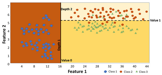 The other parameters are the number of instances involved in the node (for example in the third leaf node it is 460), the number of instances belonging to each class (for example in the second leaf node: 0 in Class 1–580 in Class 2 and 50 in Class 3), the predicted class for the node (for example in the first leaf node: Class 1). The process of prediction starts with the first root node and the question is: the instance entered by the user has a value of Feature 1 lower or equal than the Value 0; in the case of the true condition the model moves down to the left part of the tree (root’s left child node), in the case of the false condition, the model moves down to the right part of the tree (root’s right child node). From the image, it is possible to see that the root’s left child node is a leaf node, it is a node where there is not another split (no child from this node), so there is not another question and the attributed class of the instance is the one defined by the node, in this case Class 1. In the second case, the root’s right child node has another condition and in this case the question is: the instance entered by the user has a value of Feature 2 lower or equal than Value 1, in case of the true condition, the model moves on the left part, in case of the false condition the model moves to the right side. In the first case there is a leaf node with Class value equal to 2, in the second case there is another leaf node with value Class of 3. For each root node there is a threshold of one of the features that defines a boundary for the decision tree; Figure 7 shows the graphic representation of the tree of the example proposed above, with the two decision boundaries defined by Value 0 and Value 1.
