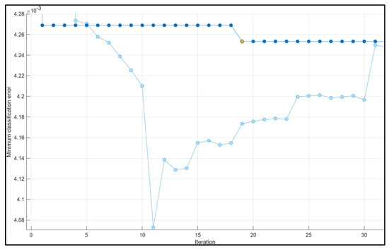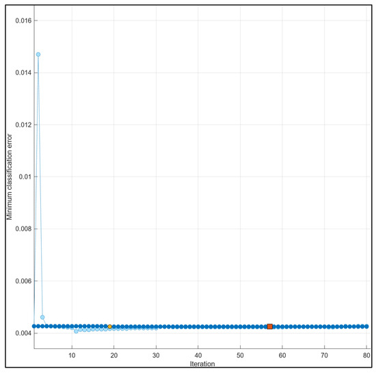 The first step of the algorithm is to split the training set using the feature (k) and the threshold (tk) that produces the purest subset. Defining the first split of the training set, the algorithm splits the subset with the same logic until reaching the stopping criteria defined by the user. The main hyperparameters that control the method are: the maximum depth, minimum sample leaf, the minimum sample split, and the cost function. The algorithm has an optimization method to find the best hyperparameters for the decision tree. The hyperparameters tuned during the process of optimization are the maximum number of splits and the criterion for the split (Gini’s diversity index, Towing rule, Maximum deviance reduction). For the first hyperparameter, the algorithm searches the best choice of depth of the tree in a range between one and the number of instances. The second hyperparameter is the variation of the split criterion between the three described above. The optimization algorithm used is the Bayesian one, the main goal is to reduce the objective function that in our case is classification error. In general, the algorithm of optimization has three fundamental steps: the process model of the objective function (in this case a Gaussian process), the Bayesian update for changing the Gaussian structure at each evaluation of the objective function, and an acquisition function to determine the next point to evaluate. The algorithm repeats these steps until it reaches a number of fixed iterations or a fixed time. In this case a maximum number of iterations was fixed. The maximum number of evaluations of the objective function imposed is 80. An example of an optimization graph is shown in Figure 8. It is possible to see the minimum classification error trend in function of Iteration; the yellow point in the graph shows the iteration where the algorithm finds the minimum value of the classification error.