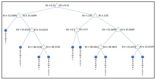 Figure 9 shows an example of an obtained decision tree with a low dept. From the figure, it is possible to see the great potentiality of the decision tree: the complete knowledge of the features used during the process. For example, the figure shows the splitting criteria for each node, in this case the three features used for the splitting are SOG (X5), Lon (X3) and Lat (X2).