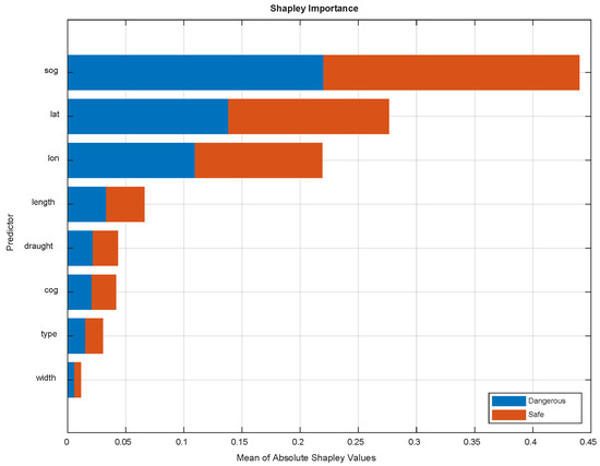 The results confirm that SOG, latitude (Lat), and longitude (Lon) are the most influential features for the model’s decisions. This finding is consistent with the physical characteristics of navigation in the Strait of Messina, where variations in position and speed are critical indicators of anomalous or unsafe behaviors. Parameters related to the ship’s dimensions (length, width, draught) and type play a minor role, confirming their limited influence on short-term risk detection.