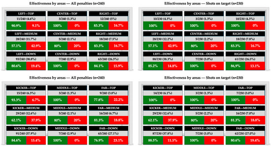 | Direction—goal | Left—Top | 6 | 3.8 | 83.3 | χ2 = 144.462 | χ2 = 9.999; p = 0.265; V = 0.29 | 5 | 6.0 | 100 | χ2 = 131.619 | χ2 = 6.103; p = 0.528; V = 0.27 | χ2 = 10.171; p = 0.253; V = 0.21 |