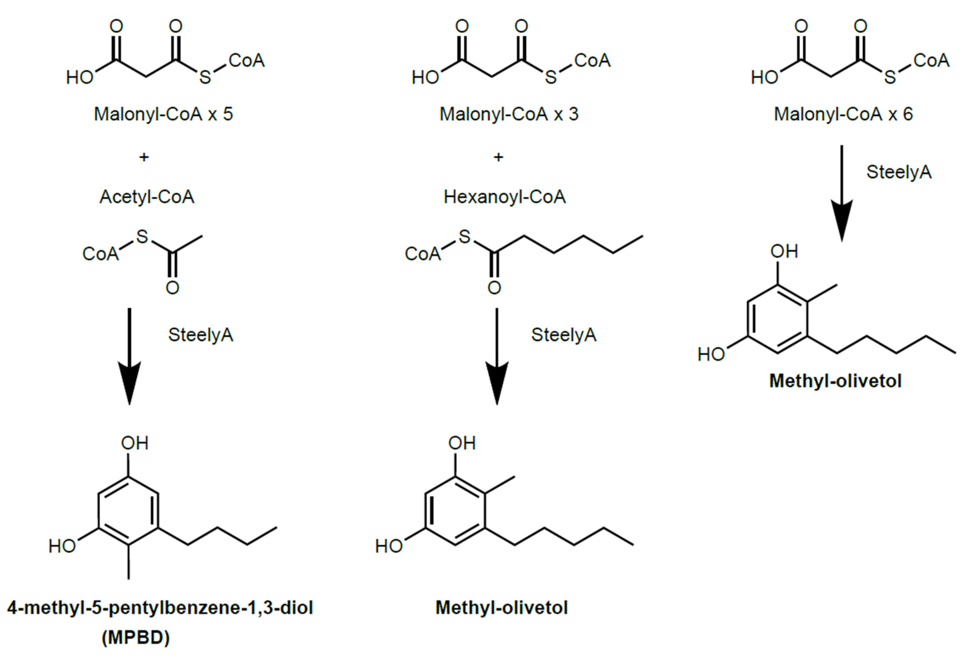 - Awwad, F.; Fantino, E.I.; Héneault, M.; Diaz-Garza, A.M.; Merindol, N.; Custeau, A.; Gélinas, S.-E.; Meddeb-Mouelhi, F.; Li, J.; Lemay, J.-F.; et al. Bioengineering of the Marine Diatom Phaeodactylum tricornutum with Cannabis Genes Enables the Production of the Cannabinoid Precursor, Olivetolic Acid. Int. J. Mol. Sci. 2023, 24, 16624. [Google Scholar] [CrossRef]