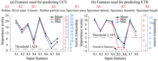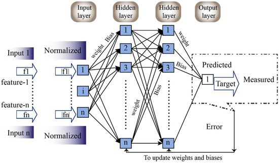 - Database generation: As mentioned in Section 2, 75 samples were used to predict the UCS of rubber-modified concrete material, and another 75 samples were used to predict ETR. Based on similar studies [18,19], the ratio of training set to test set was set equal to 80%:20%. To avoid performance anomalies in the model caused by differences in feature scales, all features are normalized to the range of −1 to 1.