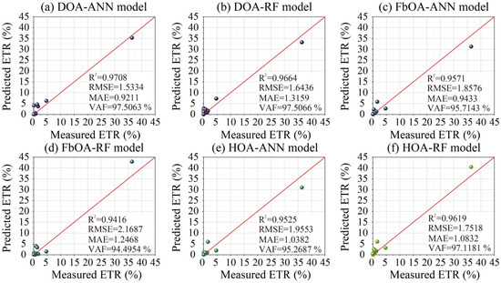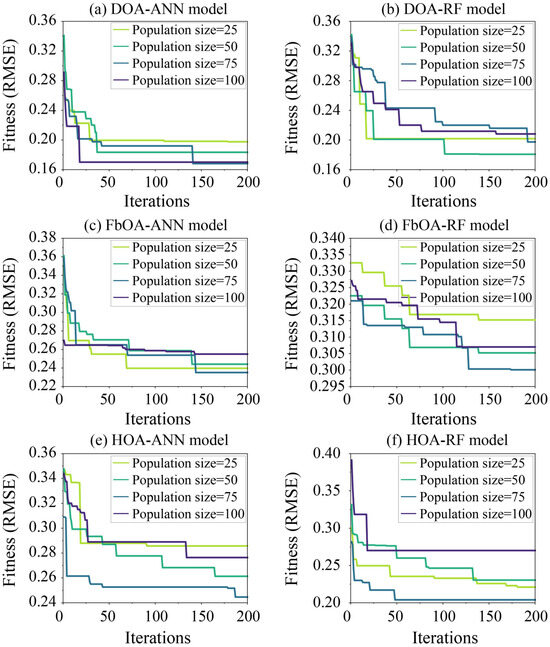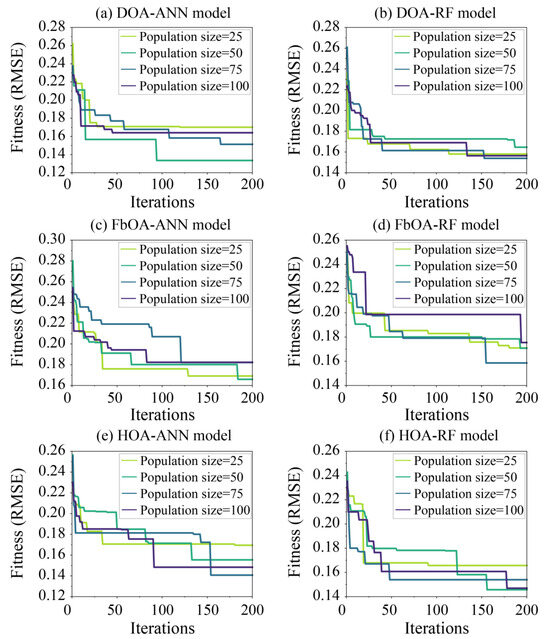 - Model construction: In this work, DOA, FbOA, and HOA were combined with ANN and RF models to generate different prediction models, i.e., DOA-ANN, DOA-RF, FbOA-ANN, FbOA-RF, HOA-ANN, and HOA-RF. For the ANN mode, the range of Nh and Nn are [1, 3] and [1, 10], respectively. For the RF model, the ranges of Nt and Md are [1, 100] and [1, 10], respectively. On the other hand, for optimization algorithms, the settings of population size and iteration count significantly affect optimization performance. A larger population size helps increase the coverage of the search space and improves the probability of finding the global optimal solution, but it also raises computational cost [32]. In contrast, a smaller population size tends to localize the search process, making it more likely to converge to a local optimum. On the other hand, the number of iterations is positively correlated with the probability of finding the optimal solution. However, excessive iterations may lead to overfitting, thus increasing computation time. In the preliminary experiments, increasing the population size beyond 100 (e.g., to 125 or 150) did not necessarily improve the model’s predictive accuracy or fitness value (R2 or RMSE), while computational time increased significantly (more than double in some cases) [18]. Therefore, the population sizes were set as 25, 50, 75, and 100 to search for the optimal solutions during 200 iterations. Moreover, the hybrid fitness function established by statistical index and cross-validation was used to evaluate optimization performance. In this paper, the root mean square error (RMSE) without absolute values was adopted as a statistical metric, and five-fold cross-validation was employed to prevent overfitting. The definition of the developed fitness function is expressed using Equation (12).