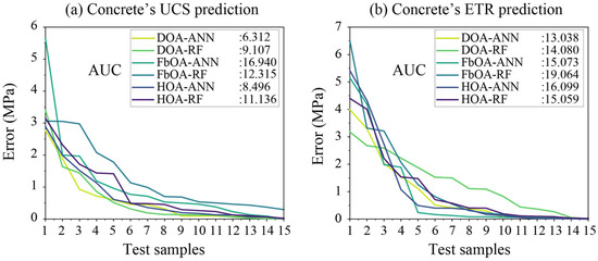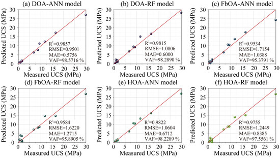 - The DOA-ANN model achieved the best predictive capability for both UCS and ETR, surpassing other optimized ANN, RF, and benchmark ML models. These results indicate the ANN’s superior ability to capture nonlinear and coupled relationships between input variables and target properties compared with RF and other ML models. The model effectively balances generalization and precision, confirming its robustness in predicting both the material’s strength and energy absorption performance.