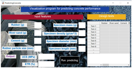 - To enhance practical applicability, a visualization interface embedding the optimized DOA-ANN model was developed. This tool allows engineers to input mix parameters, instantly predict mechanical performance, and iteratively adjust designs in real time. The system bridges model computation with practical engineering design, significantly improving design efficiency and facilitating performance-driven mix proportioning for aseismic and sustainable concrete structures.
