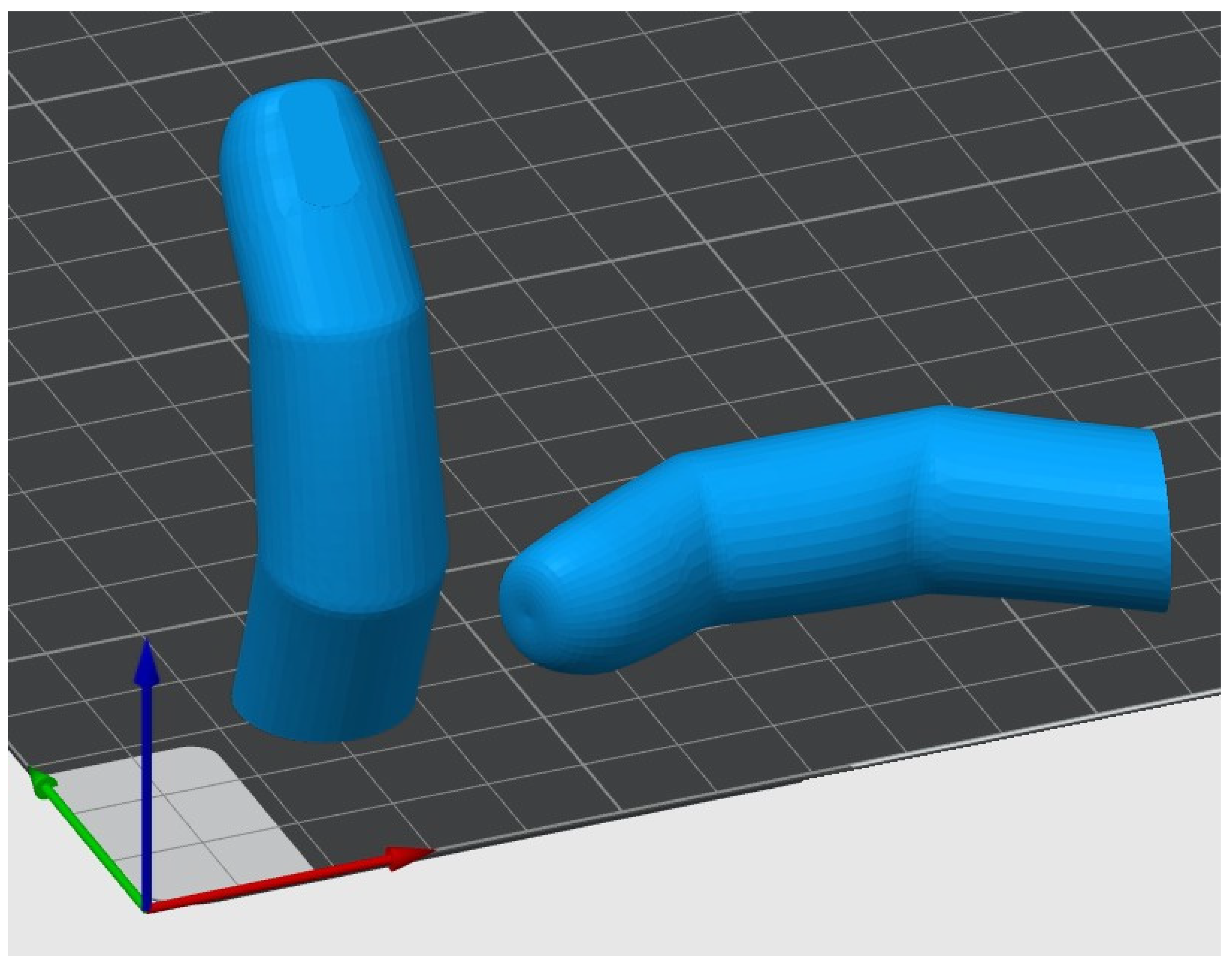 2, with overall dimensions of 19 × 64 × 46 mm. The scan data was not modified, as it served as the basis for producing a monolithic cosmetic hand prosthesis. In cases where the fingers were intended to function as components of a more complex prosthetic system, the geometry could be segmented into smaller parts or augmented with additional structural features, depending on the type and function of the target prosthesis. It should be noted that the prosthetic fingers, which are components of a hand prosthesis, do not maintain permanent contact with the human body. The issue of medical biocompatibility is not a central concern in the present study.