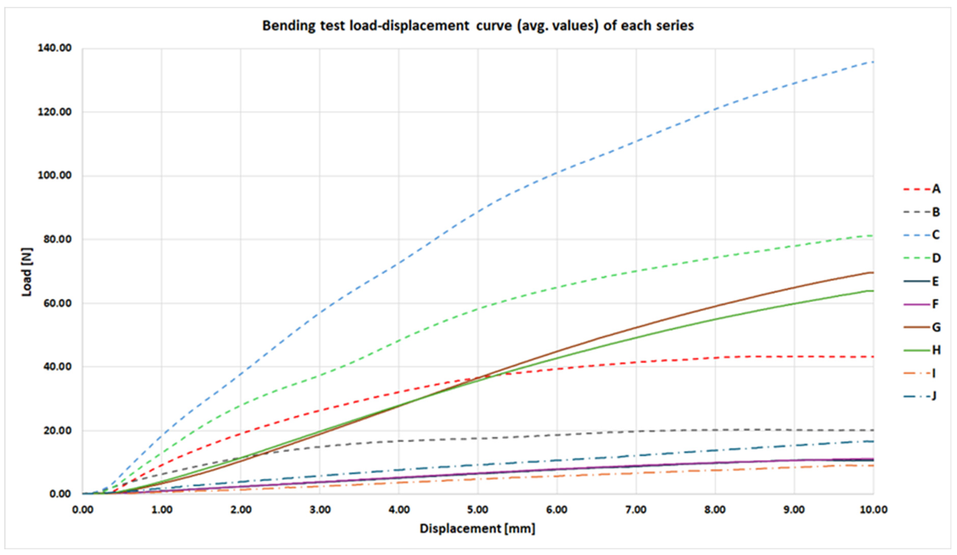 The bending strength tests were conducted at a loading rate of 5 mm/min, until a displacement of 10 mm between the support points was reached. The results, presented as average force–displacement curves, are shown in