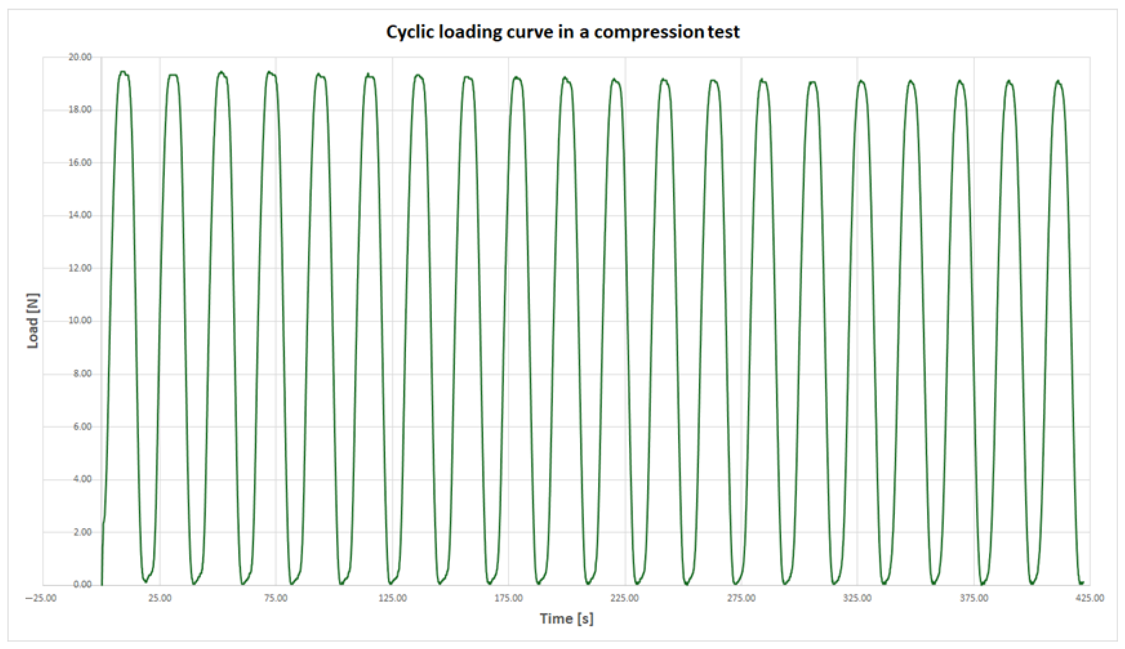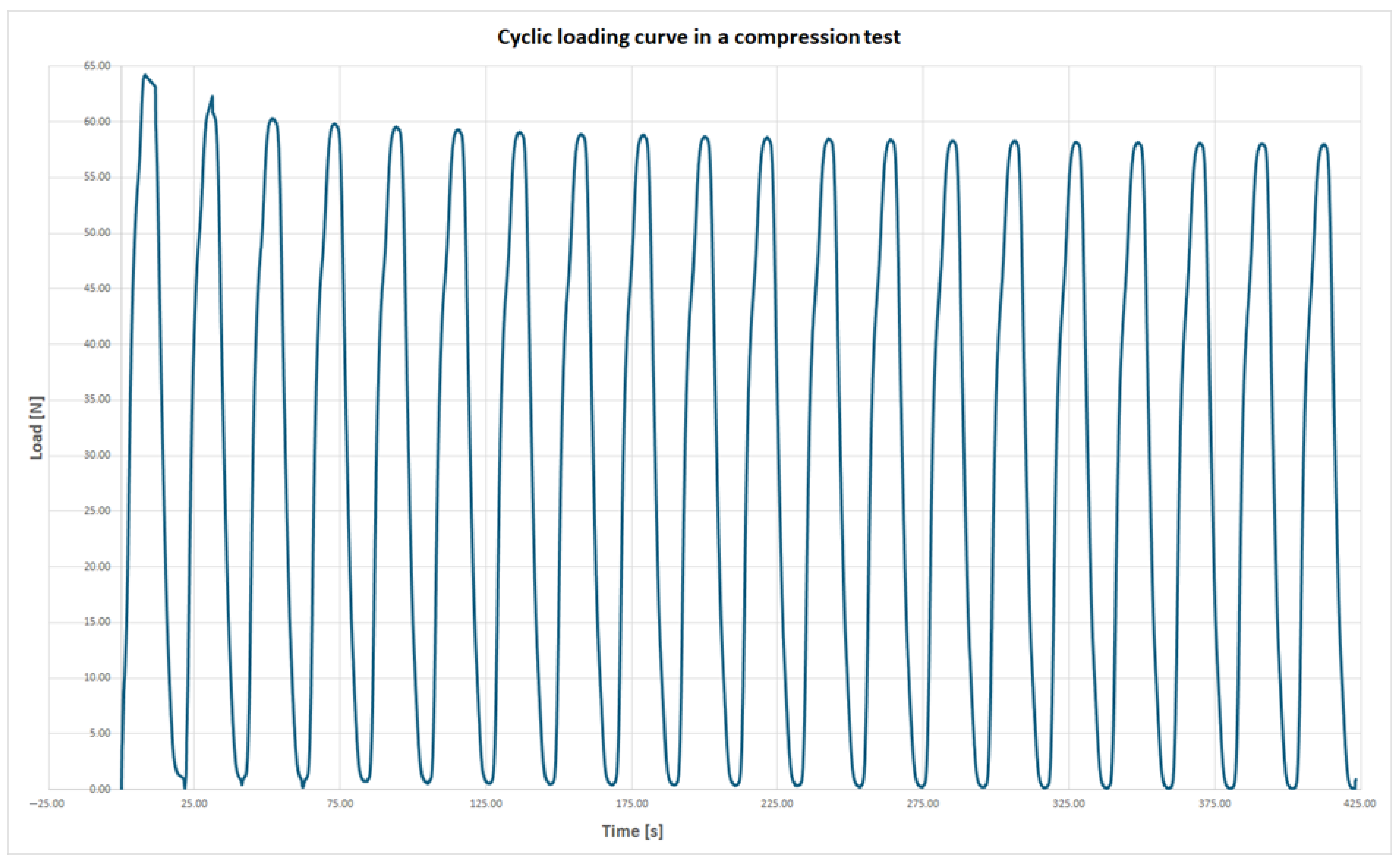The conducted tests were not fatigue tests and were not intended to induce failure of the specimens. However, by subjecting each sample to cyclic compressive loading, it was possible to assess whether the stress applied during the initial cycle had caused any internal damage. Such damage would manifest as variations in the mechanical response during subsequent loading cycles. The number of loading cycles was limited to 20. Each cycle lasted 20 s, with equal time allocated for achieving a 10 mm displacement and returning to the initial position.