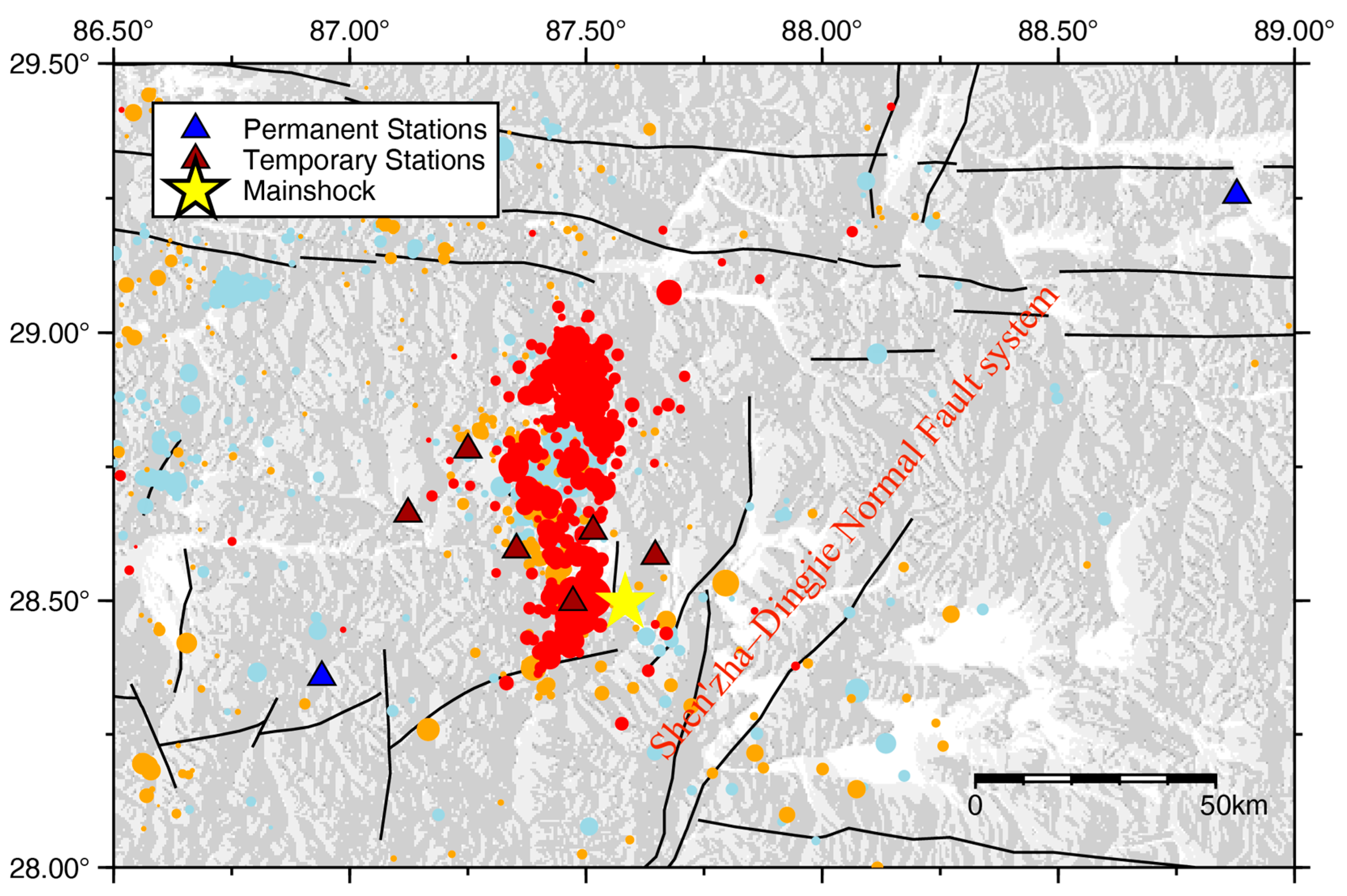 - Xu, X.; Wang, S.; Cheng, J.; Wu, X. Shaking the Tibetan Plateau: Insights from the MW 7.1 Dingri earthquake and its implications for active fault mapping and disaster mitigation. NPJ Nat. Hazards 2025, 2, 16. [Google Scholar] [CrossRef]