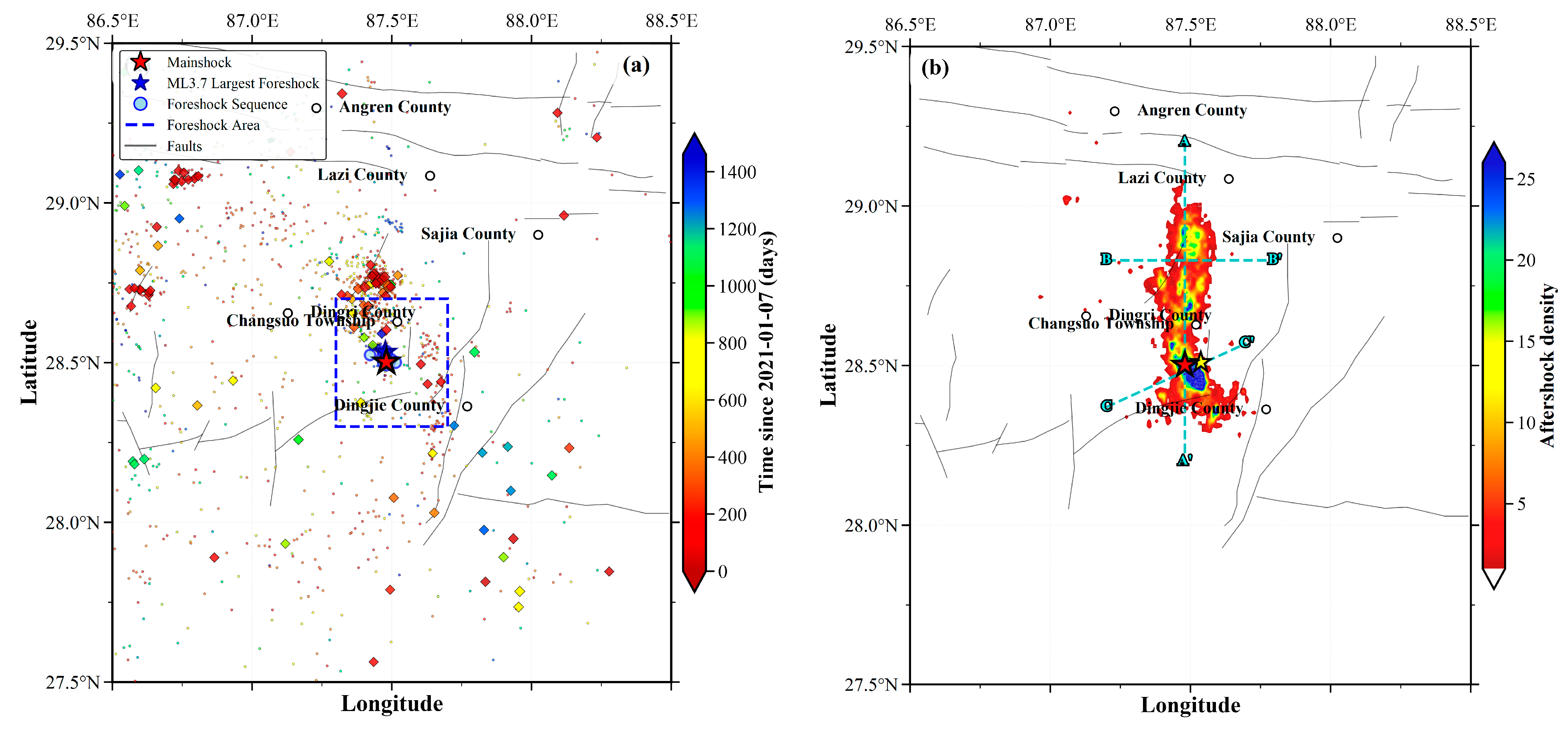 APA StyleWang, X., Lu, Y., Yin, X., Cai, R., Zhou, L., Wang, S., & Liu, F. (2025). B-Value Spatiotemporal Changes and Aftershock Correlation Prior to the Mwg 7.1 Dingri Earthquake in Southern Tibet: Implications for Land Deformation and Seismic Risk. Applied Sciences, 15(21), 11685. https://doi.org/10.3390/app152111685