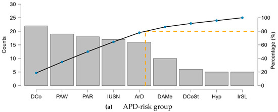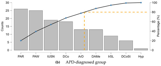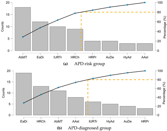 Pareto charts of developmental factors for the APD-risk group (a) and (b) APD-diagnosed group (b).