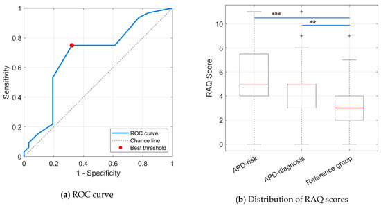 RAQ scores significantly differed across the three groups (APD-risk, APD-diagnosed, reference) (Kruskal–Wallis test, p = 0.0019, ε2 = 0.117). Post hoc Mann–Whitney analysis revealed significant differences between the reference group and both APD groups, but not between the APD-risk and APD-diagnosed groups (r for APD-diagnosed vs. APD-risk: 0.131; r for APD-diagnosed vs. reference: 0.319; r for APD-risk vs. reference: 0.435). Receiver operating characteristic (ROC) analysis yielded an AUC of 0.68, with a sensitivity of 75% and specificity of 68% at an optimal cut-off score of 4 points (Youden Index). These findings are illustrated in Figure 3, which presents (a) the ROC curve demonstrating the discriminative ability of the RAQ, and (b) the distribution of RAQ scores across diagnostic groups, with detailed descriptive statistics provided in Table 7.