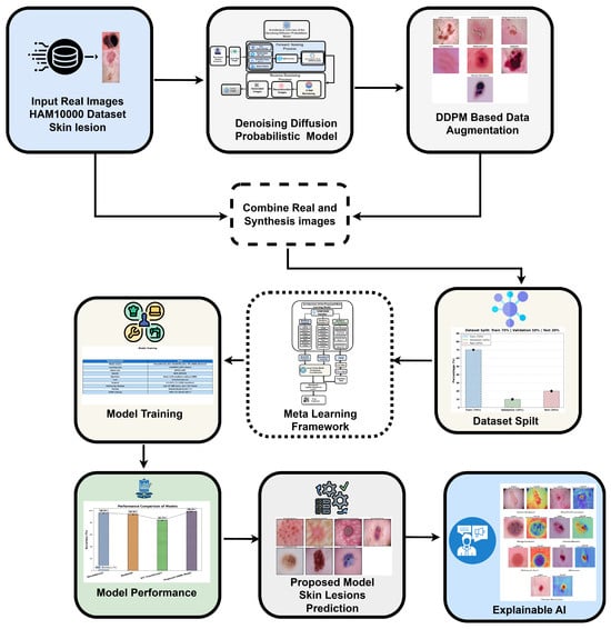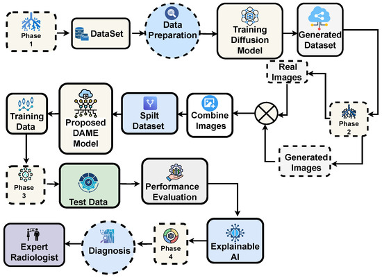 The overall proposed framework for multi-class skin lesion diagnosis is detailed in this section, as shown in Figure 3. The framework begins with aata acquisition and sampling, followed by training a generative diffusion network to generate synthetic dermoscopic images. Original and generated images are combined to form an augmented dataset, which is subsequently used to train the proposed DAME architecture. The dataset is split into training and testing subsets, enabling performance analysis on both real and synthetic images. Performance is evaluated using standard diagnostic metrics, and expert radiologists verified the accuracy of the predictions. Finally, explainable AI techniques are applied to enhance model interpretability and support reliable clinical diagnosis.