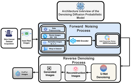 To generate high-resolution dermatological images conditioned on textual information, we utilized a Denoising Diffusion Probabilistic Model (DDPM) framework constructed using the Diffusers and Transformers libraries. A Variational Autoencoder (VAE) was used to encode dermoscopic images into a latent space after they had been reduced to 512 × 512 pixels, transformed into tensors, and normalized to [−1, 1]. The forward diffusion process was then replicated by gradually adding Gaussian noise to the latent codes in accordance with a specified schedule, with distortion managed by a particular strength parameter. The forward diffusion is a Markov chain that adds Gaussian noise at each step: