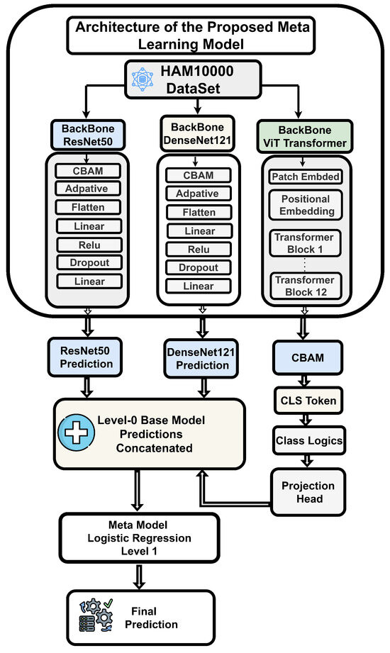 In the meta-learning methodology outlined in this article, as in [35,43,44], several convolutional neural networks (CNNs) are used as baseline models. The models were first trained with the ImageNet dataset, which comprises normal picture datasets, and then extended with the HAM10000 skin cancer dataset, which contains high-resolution dermoscopic images representing diverse types of skin cancer. This two-stage training approach leverages the strengths of transfer learning, preserving low-level feature representations from large-scale data while adapting higher-level parameters to the target domain. The use of meta learning further enhances this process by equipping the models with the capacity to quickly generalize to new classification tasks, leveraging past knowledge and drawing upon experience collected through earlier iterations, retained from the prior training phase. Fine-tuning configurations of the proposed models for classification are summarized in Table 4. And Algorithm 1 shows skin cancer classification.