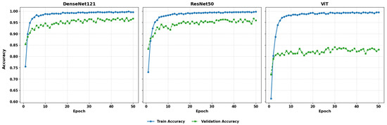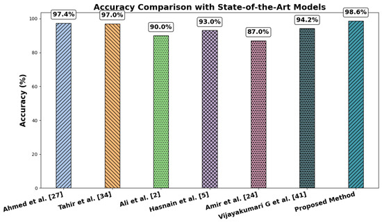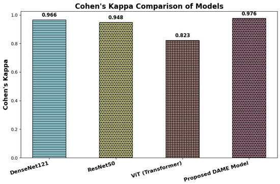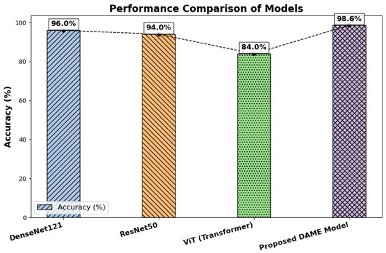 The proposed DAME framework demonstrated noticeable enhancements compared to state-of-the-art methods. Earlier studies employing CNN-only architectures, such as ResNet50 and DenseNet121, generally had macro F1-scores below 0.85 and classification accuracies in the range of 87–97% as shown in Table 8. In contrast, DAME outperformed both convolutional and transformer stand-alone models, achieving an overall test accuracy of 98.6%.