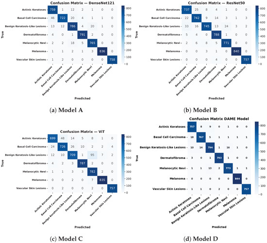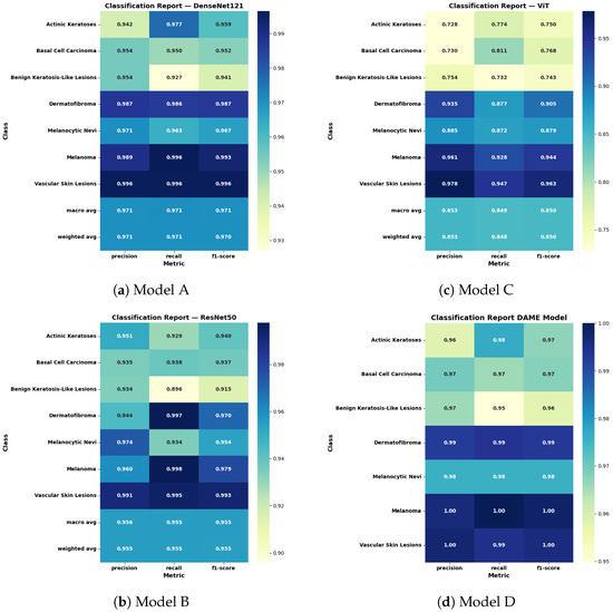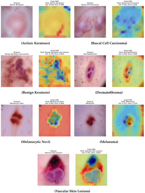 Overall, these visualizations support the explanation of the framework DAME, as they indicate that the diagnostic cues are correlated with the mechanisms of attention. Additionally, the relative stability of the activation maps, along with their morphological properties and the weight capability, highlights the key concepts of explainable AI in medical imaging, as exemplified by the framework’s ability to adjust its focus according to a region-specific shape. The process is especially important in distinguishing the small differences between classes in cases where categories are literally indistinguishable in appearance, such as an abnormal nevus and a small melanoma tumor. In addition to making the concept easier, this adaptive saliency provides greater confidence that it can be used practically in the clinical setting. The DAME methodology uses interpretable visual feedback to fill the gap between reason-based reasoning and inference based on facts. This observation also demonstrates that the model has high potential for generalizing lesions of varying textures, shapes, and pigmentation patterns. The DAME framework addresses the issue of black-box images, which are commonly assumed to be part of deep learning models, by aligning the learned attention maps with interpretable features to those of an expert. It is necessary to mention that the localization of attention with fine spatial fidelity is in agreement with clinical indicators, i.e., asymmetry, irregularity of the border, color heterogeneity, and the most striking indicators in dermatological diagnosis. The hierarchical structure of the model, particularly in complicated cases involving overlapping classes or a question mark, is well incorporated, as it is both globally uniform and locally sensitive. Such insights may not only enhance interpretability but also lay the foundations for a clinician–AI collaboration in diagnostic processes. This leads to an improvement in the technical reliability and ethical accountability of AI-aided medical imaging due to the high explicability of the DAME design.