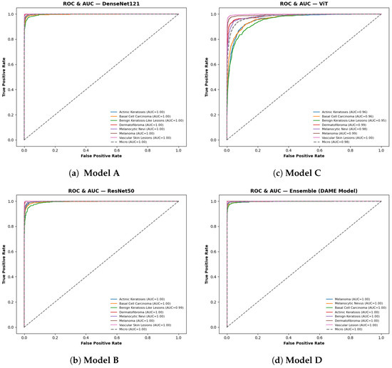 The use of high-resolution synthetic images generated by DDPM not only mitigated the limitations of small sample learning but also enhanced the model’s ability to generalize to underrepresented lesion types. Further evidence of DAME’s effectiveness came from the interpretability and robustness evaluations. Grad-CAM visualizations confirmed that the model consistently focused on clinically relevant lesion regions, while ROC AUC confirmed improved discrimination between classes compared to traditional ensemble methods. These findings underscore the robustness of DAME and its potential applicability in real-world clinical decision support systems.
