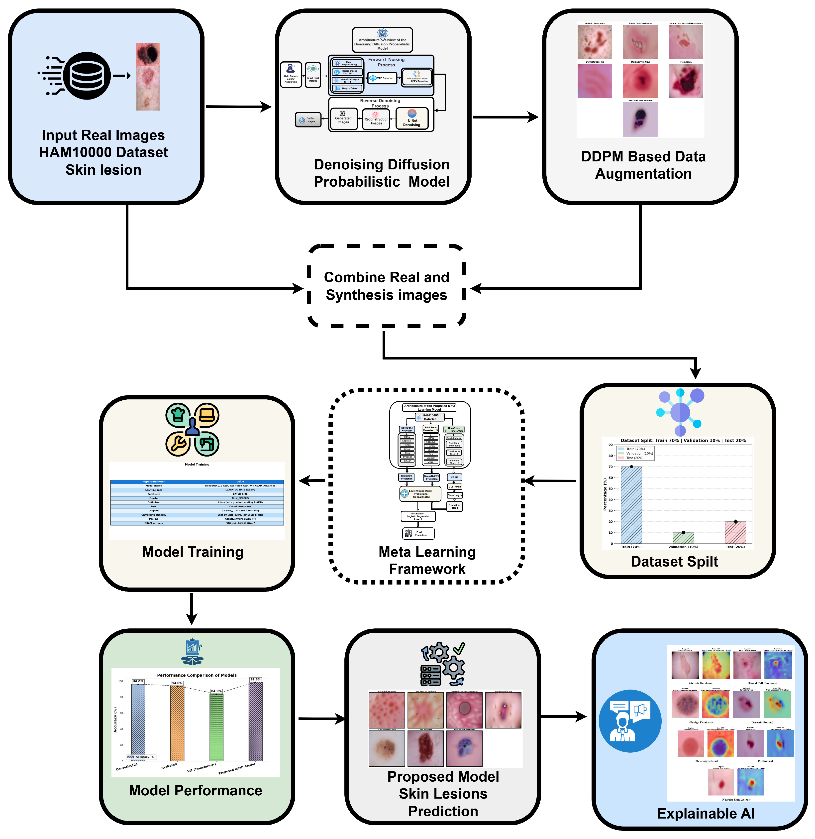 Our research proposes the DAME (Diffusion-Augmented Meta-Learning Ensemble) framework, a unified multi-architecture deep learning model that synergistically combines convolutional backbones (ResNet50 and VGG19) with a Vision Transformer (ViT) module.