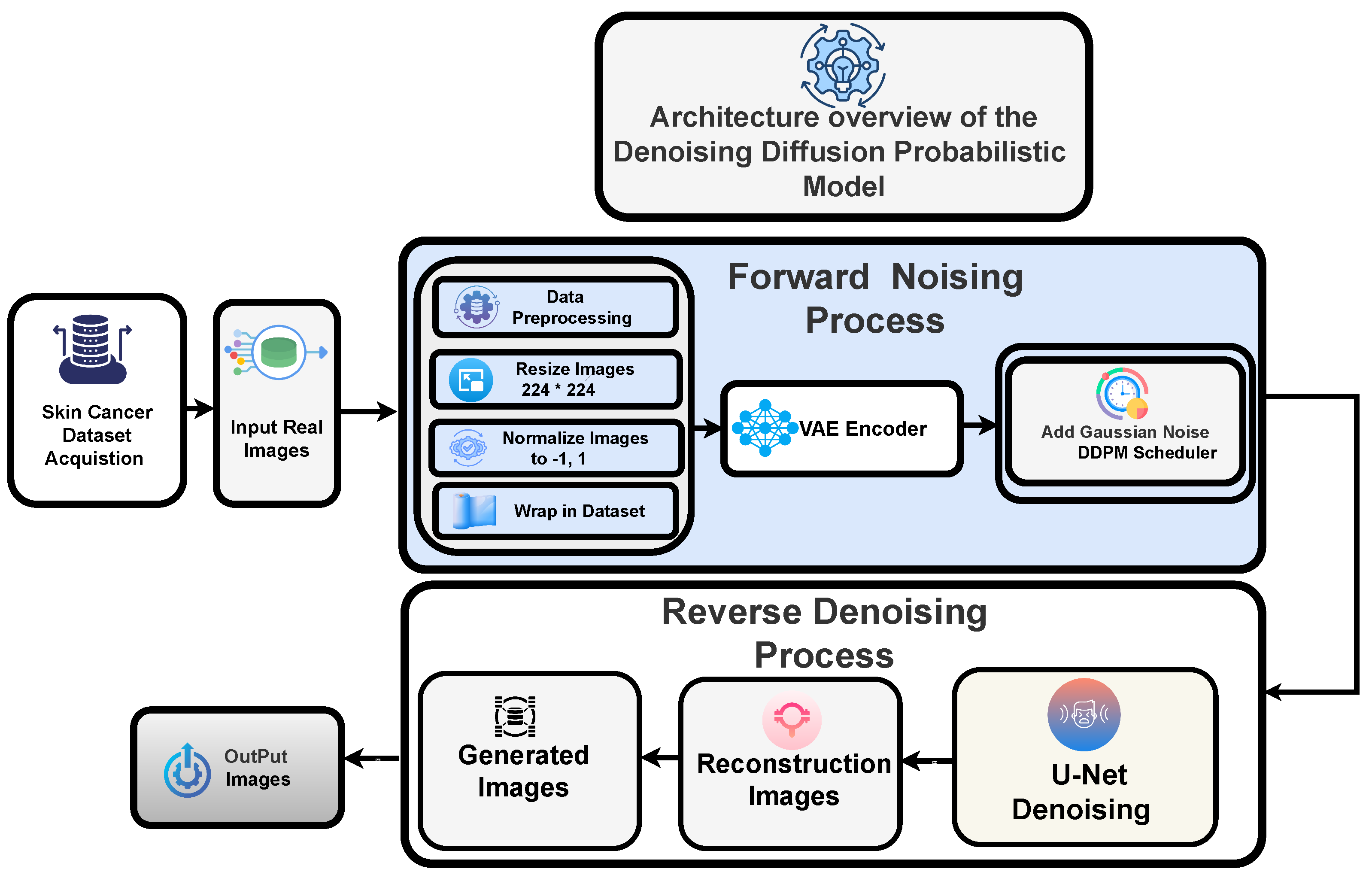 (1) Developing both the imaging and modeling aspects of skin cancer diagnosis remains a key research focus. Modern imaging techniques, including multiphoton lifetime tomography, confocal microscopy, optical coherence tomography, and photoacoustic imaging, offer high-resolution structural and biochemical information. (2) Developing lightweight versions of DDPM to make them more efficient to deploy. (3) Generalizing the model to multi-modal and multitask learning conditions to improve generalization. (4) Including real-life clinical feedback into an end-to-end training pipeline to make it more practical. (5) Evaluating the model with real-world clinical datasets that are noisy, inconsistently annotated, have imaging artifacts, and inter-patient variation. (6) Refining domain-adaptive DDPM versions for improved reliability and practical evaluation. These efforts aim to develop more robust models and more accurately determine the utility of such models in clinical practice.