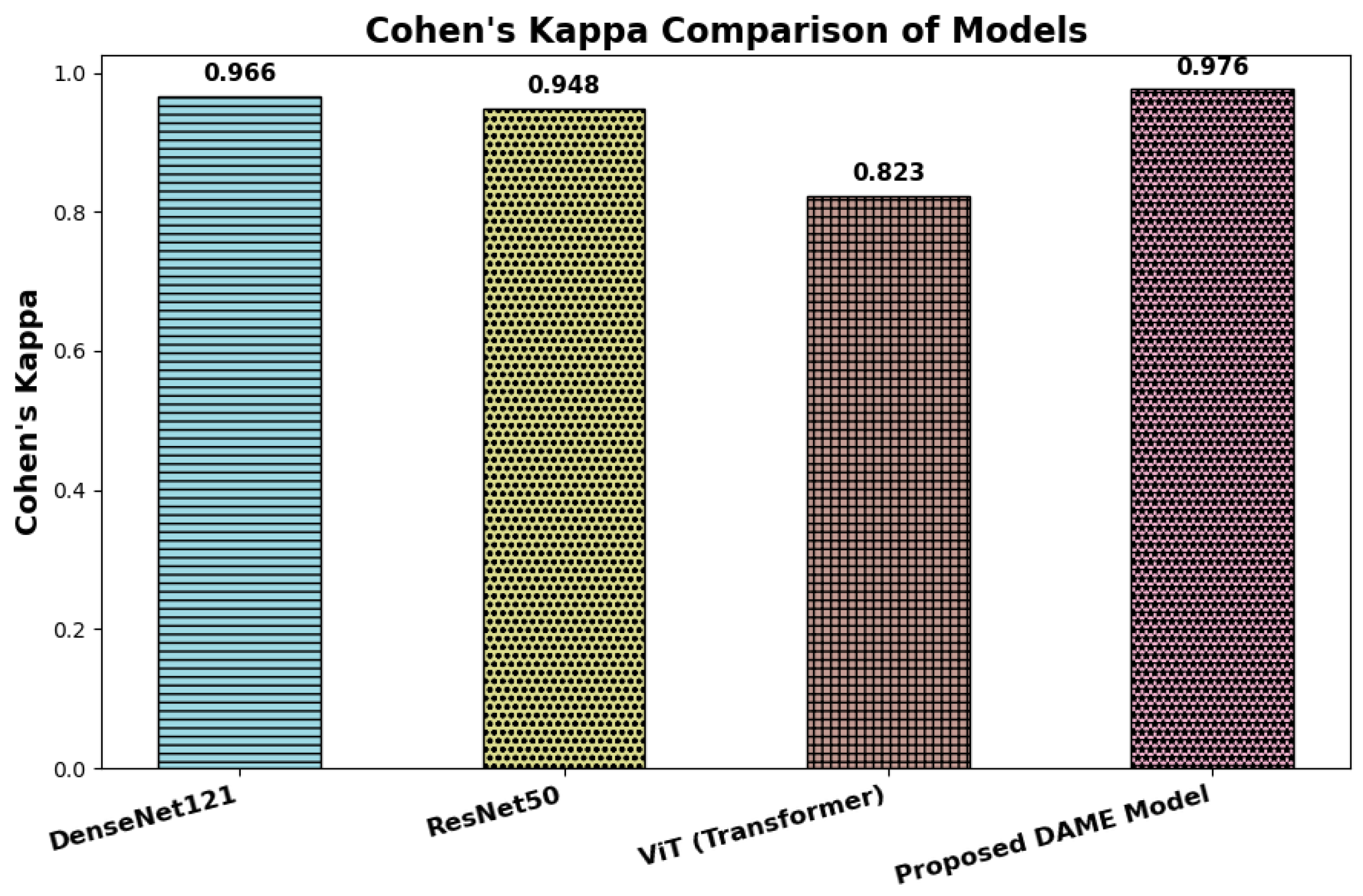 Cohen’s Kappa presents a comparative evaluation of inter-rater agreement across four deep learning architectures: DenseNet121, ResNet50, Vision Transformer (ViT), and the proposed DAME model, based on their respective Cohen’s Kappa (κ) values. Cohen’s Kappa is a robust reliability coefficient that quantifies the degree of agreement between predicted and ground truth labels while accounting for agreement expected by chance. Unlike overall accuracy, Cohen’s Kappa provides a more dependable measure of consistency, particularly in multi-class and imbalanced classification scenarios common in clinical image analysis.