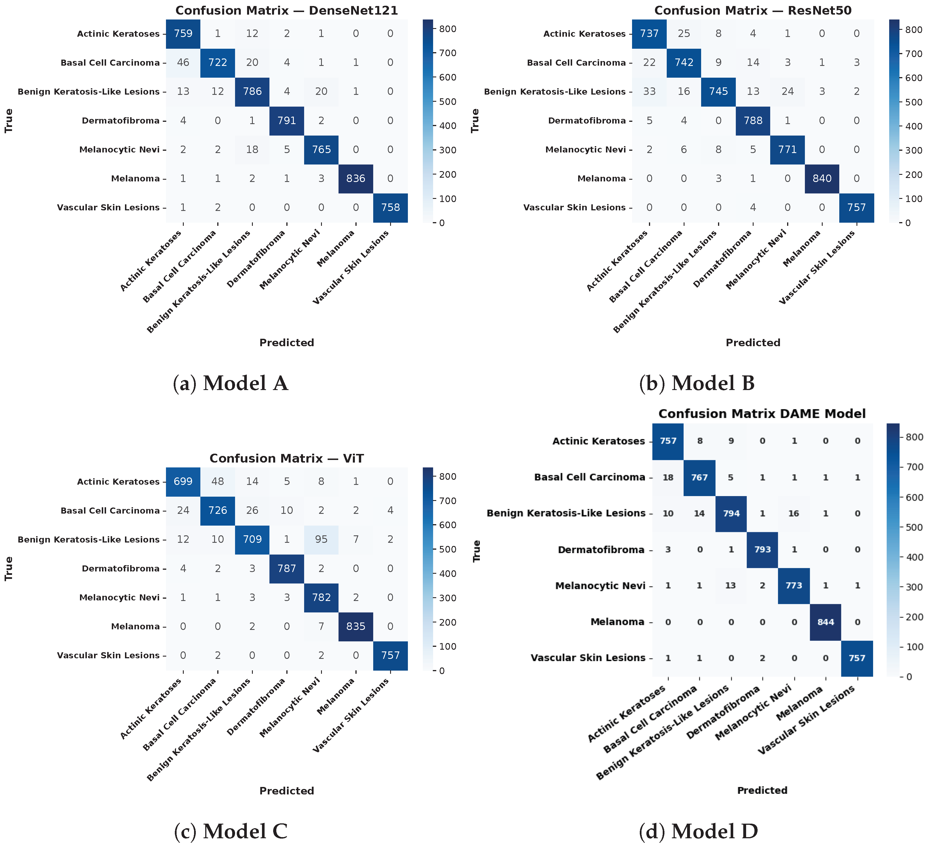 The performance of four deep learning models DenseNet121 with the Convolutional Block Attention Module (CBAM), ResNet50 integrated with CBAM, the Vision Transformer (ViT) combined with CBAM, and the proposed DAME configuration was comprehensively evaluated using confusion matrices across seven clinically significant dermatological classes.