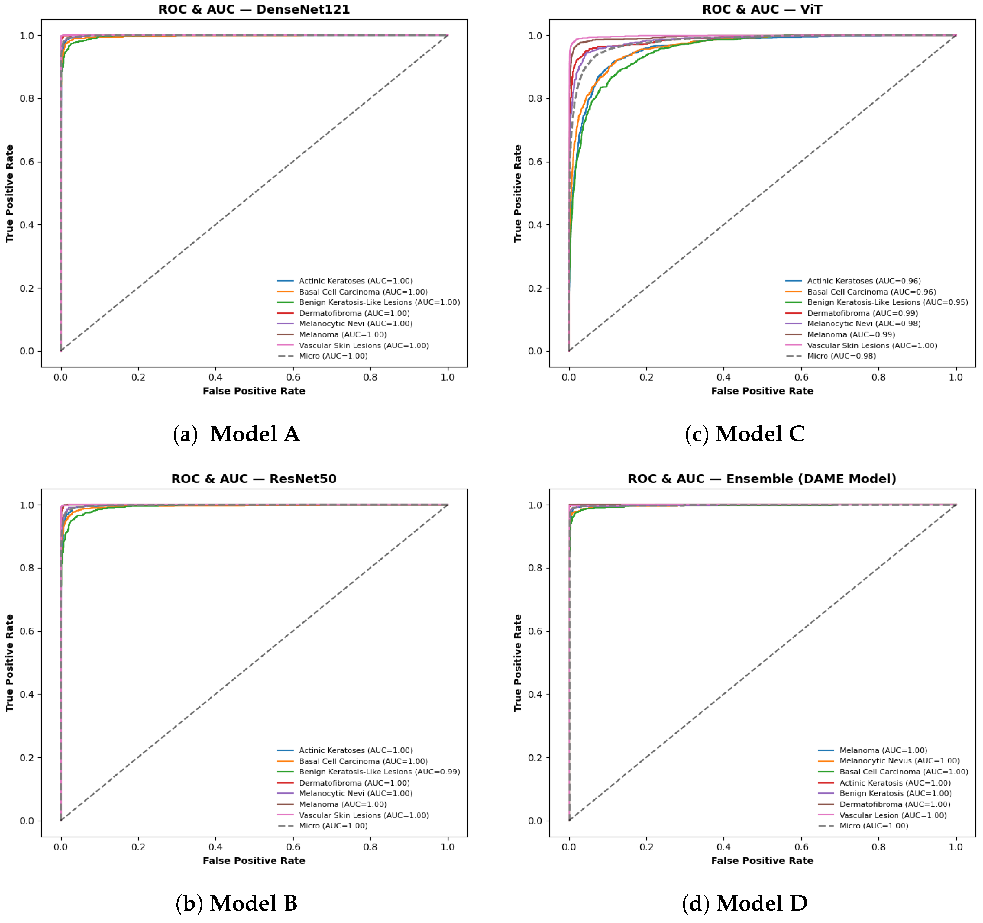 The ROC AUC evaluation illustrates the models’ validation performance in multi-class dermatological classification. Across all assessments, the macro-averaged ROC curves demonstrated near-perfect class separability, with both DenseNet121 and the proposed DAME ensemble achieving the highest AUC value of 1.00. ResNet50 and the Vision Transformer (ViT) followed closely, with AUC values of 1.00 and 0.98, respectively. The micro-averaged AUC results supported this trend, confirming strong predictive consistency across heterogeneous lesion categories. There was a strong performance in per-class analysis. Dermatofibroma, Melanoma, and Vascular Skin Lesions were able to achieve perfect classification (AUC = 1.000), whereas Actinic Keratoses and basal cell carcinoma had slightly lower but still perfect results of between 0.990 and 0.998.