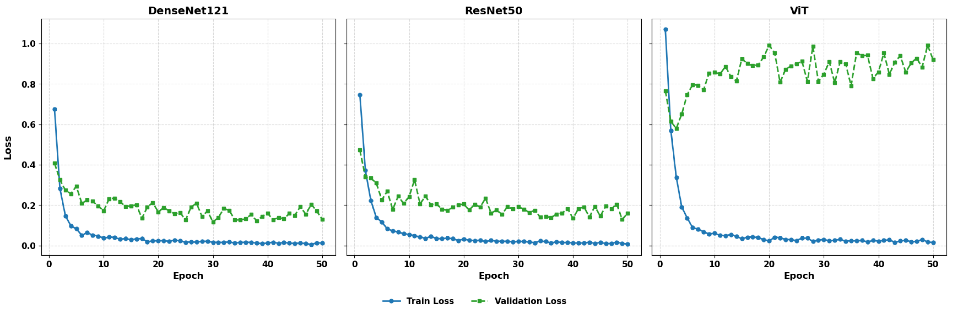 Figure 11 illustrates the comparative training and validation loss plots for DenseNet121, ResNet50, and ViT.