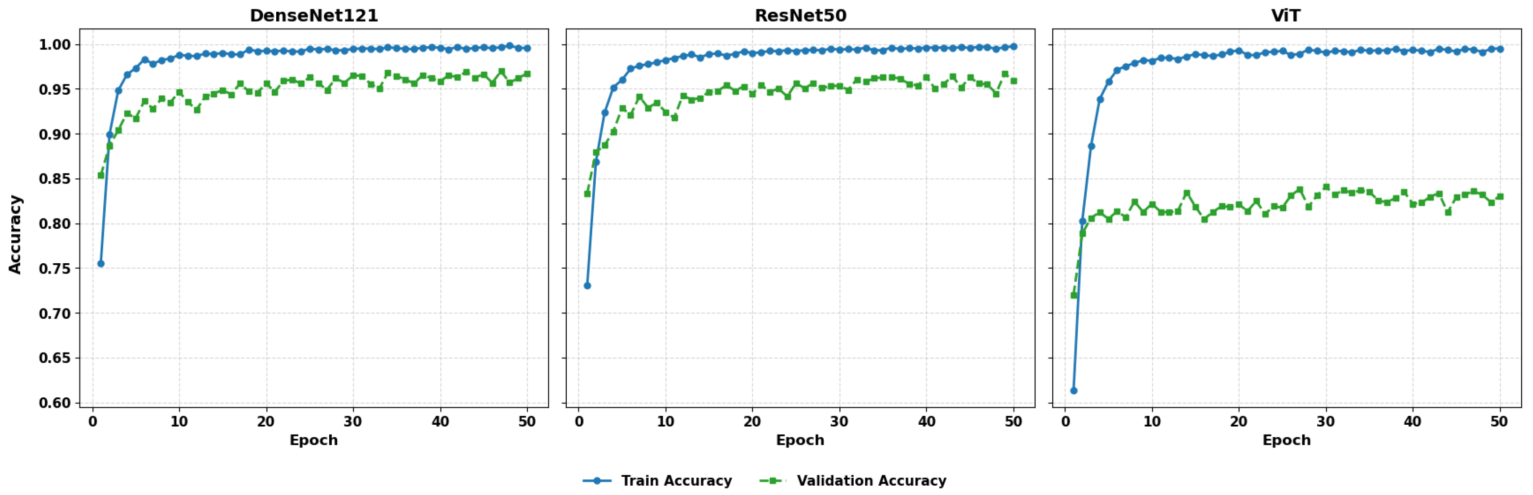 Figure 12 presents the training and validation accuracy with 50 epochs. The DenseNet121, ResNet50, and ViT models demonstrate high training accuracy, which reaches nearly 100% after the initial ten epochs, and their validation accuracy increases to 96–98%. DenseNet121 and ResNet50 have a small margin in terms of training and validation performance, which represents good generalization. On the other hand, ViT has been shown to have greater variability in validation accuracy, although training accuracy is close to perfect, suggesting possible overfitting or a lack of regularization. These findings suggest that, although ViT demonstrates high representational capacity, additional tuning or architectural adaptation may be required to achieve consistent performance.
