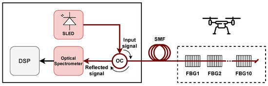 The experimental setup block diagram is depicted in Figure 1, and captured photographs of the experiment setup can be seen in Figure 2a. The setup includes the fiber that is placed in a plastic trench to minimize any side airflow induced by the drone or other external sources of air movement that could affect the strain on the fiber. The fiber is securely fixed between each sensor, creating 10 independent sections, each 10 cm long, where each section is equipped with one sensor. The integrated FBGs in this fiber optical network feature a full width at half-maximum (FWHM) of less than 0.5 nm, light reflectivity exceeding 95%, and a suppression ratio of side-lobes (SRSL) greater than 15 dB. The reflected wavelength spacing between the sensors is 5 nm, with an initial reflected wavelength in the range of 1520 to 1565 nm. The raw wavelength shift data from the deformed FBG sensors can be converted into a strain value using Formula (1):