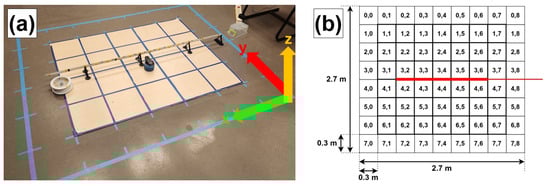 The DJI Avata (Shenzhen, China) drone with a rotor diameter of 0.074 and 5 blades per rotor was used as an object-under-test that can hover and fly over the fiber in accordance with the outlined squares as shown in Figure 2a. The size of each unit square is equal to 30 by 30 cm and is comparable to the drone size. Each square corresponds to the coordinate system values (x,y), where x and y are 0:1:8 as depicted in Figure 2b. The red straight line on the coordinate system presents the fiber part with ten equidistantly distributed FBG sensors (two sensors per unit square) that are placed exactly in the middle of the flight area.