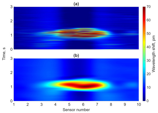 The calibration coefficients for the used FBGs are and B = 5.892923 · 10−6 °C−1. It is worth noting that with temperature changes below 0.1 °C, which was the case in our scenario, the second term becomes negligible while the first term is never negligible. Regardless, during the experiments, temperature compensation was performed.