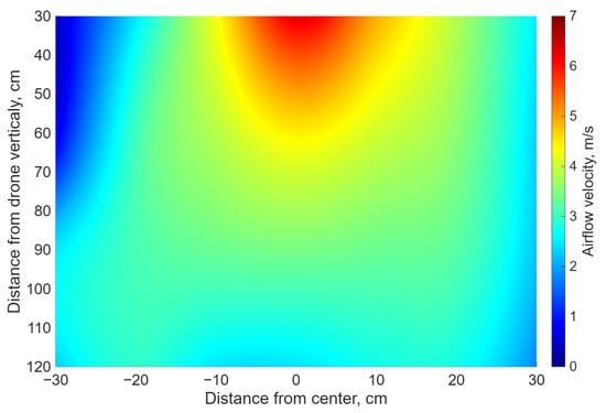 As visible in the figure, the UAV creates an area of high intensity downwash directly below it and then two distinct pockets of airflow further down, when viewed as a 2D slice. A low-pressure air pocket directly below and a small distance away from the hull of the UAV forms due to there being two rows of propellers, meaning two sets of vortices below them. With higher intensity vortices, they appear to merge, while at lower intensities, they can be distinguished. This phenomenon is also noticed by other authors [41,42]. From this, it can be concluded that it is not always possible to localize a UAV by only locating the sensor that is most deformed and deducing that the object passed the system at that point. By analyzing the downwash data of different flights passing the FBG sensor array, an effective method for UAV localization can be achieved.