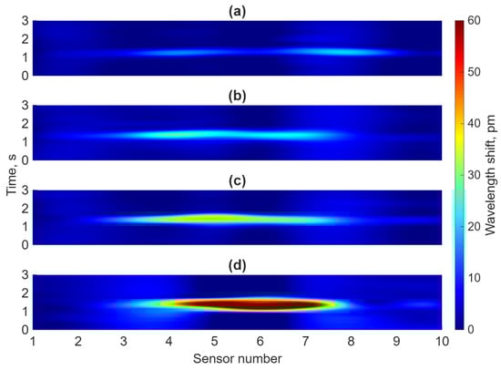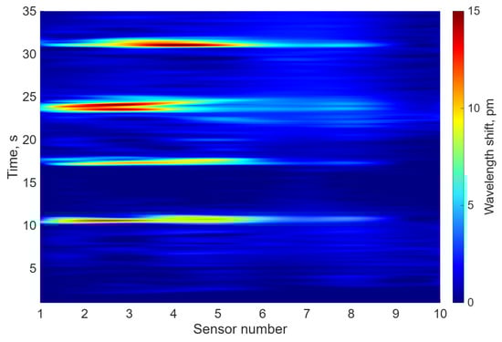 The experimental study included two sets of measurements designed to give insight into the ability of the proposed FBG sensor array to correctly identify the location of an overpassing UAV. The first set of measurements served as a tool for height analysis, which allows evaluating the viability of UAV flight height detection and possible extension to object differentiation. Four flights were performed at the heights of 30, 60, 90, and 120 above the sensor array. The induced wavelength shift on the FBG sensors in the baseline measurements can be seen in Figure 5.