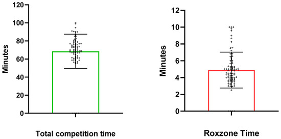 Figure 1). It presents the average total competition time (1:11:15 ± 13:26 min) and the mean duration spent in the functional Roxzone area (5:02 ± 2:00 min). These metrics provide insights into efficiency and effort regulation during functional segments, which are key determinants of overall performance.