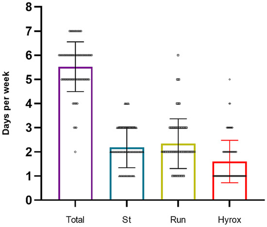 Regarding weekly training frequency, the data indicated a mean of 5.5 ± 1.03 days per week, reflecting a high level of commitment and training volume consistent with the physical demands of the Hyrox© discipline, and suggesting training routines aimed to optimizing performance.