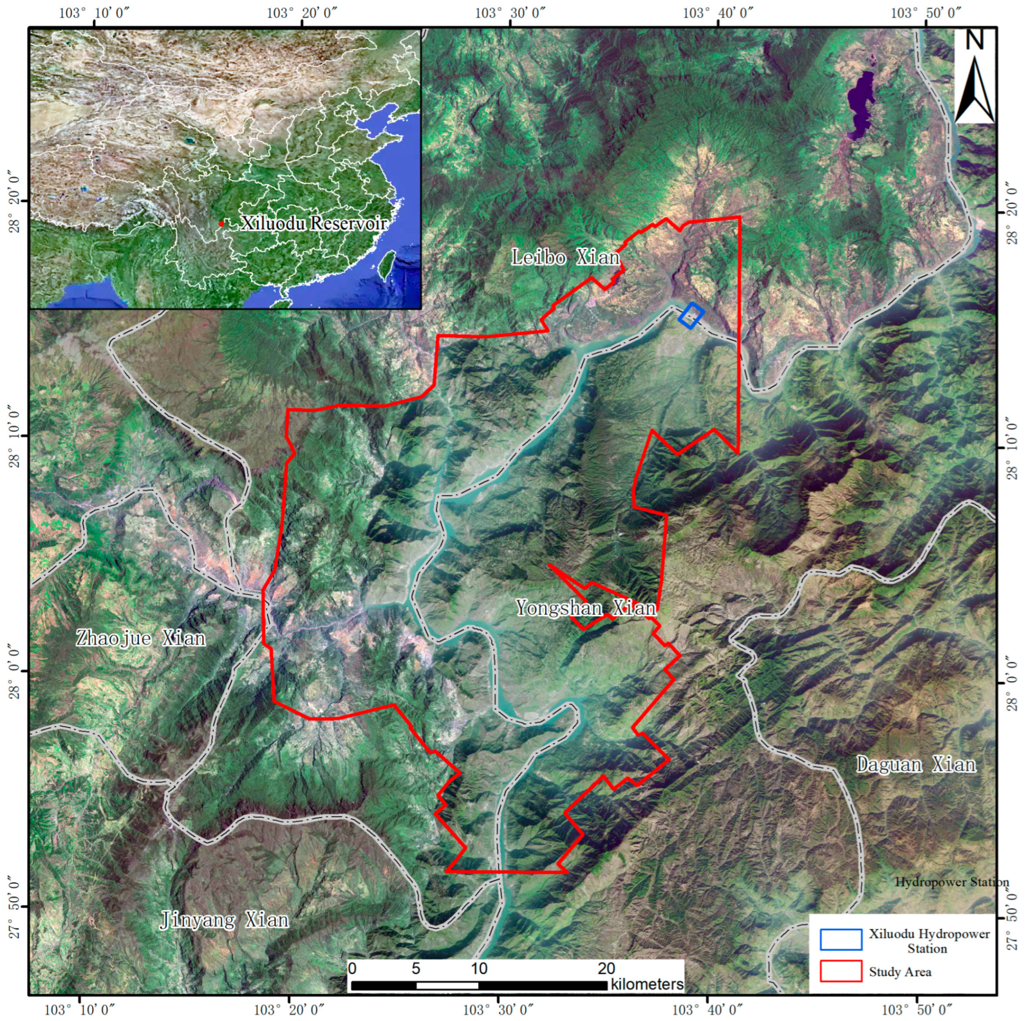 - Tang, F.J.; Qi, S.W.; Guo, S.F.; Zou, Y.; Li, Y.; Lu, X.; Hou, X. Spatiotemporal distribution Patterns and susceptibility of reservoir-induced landslides in the Xiluodu reservoir area of the Jinsha River. J. Eng. Geol. 2022, 30, 609–620. [Google Scholar]