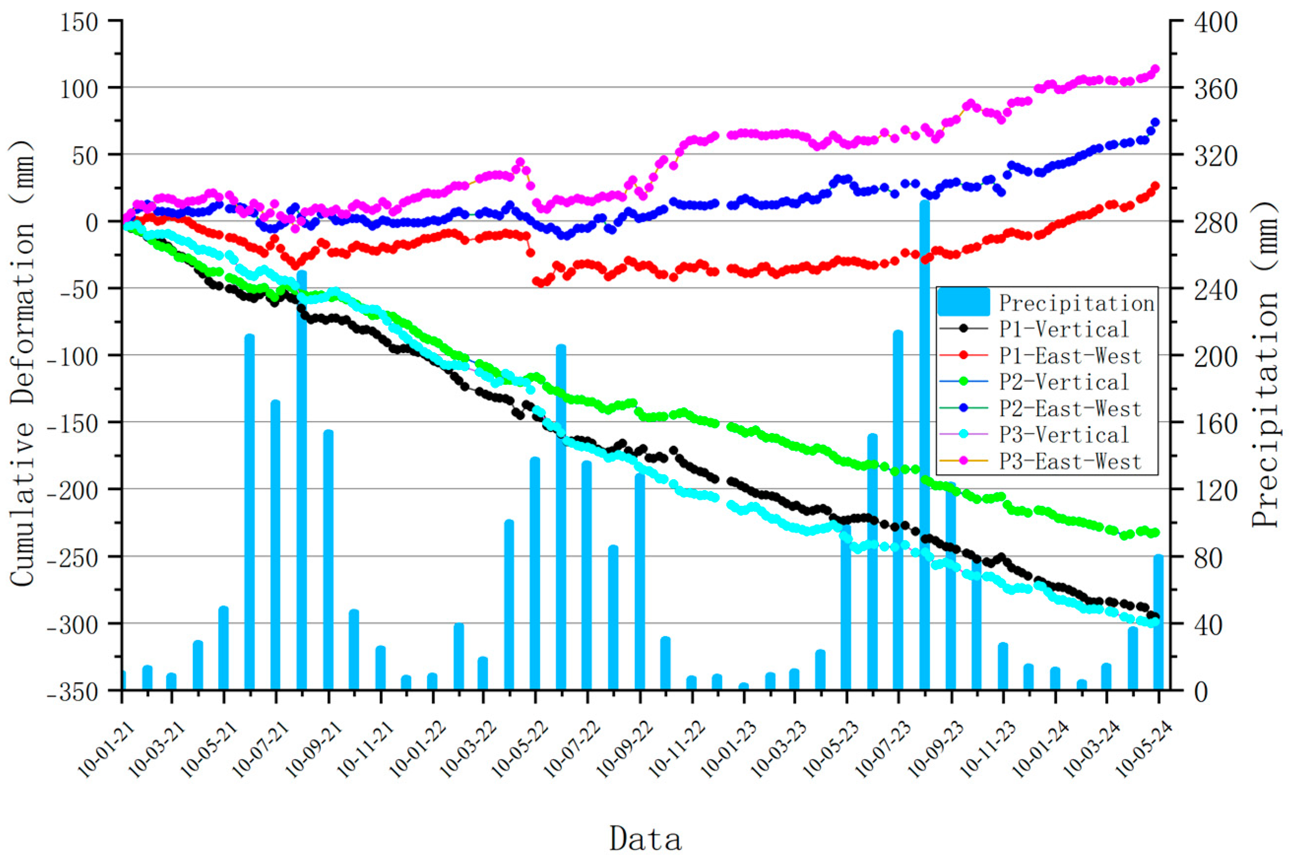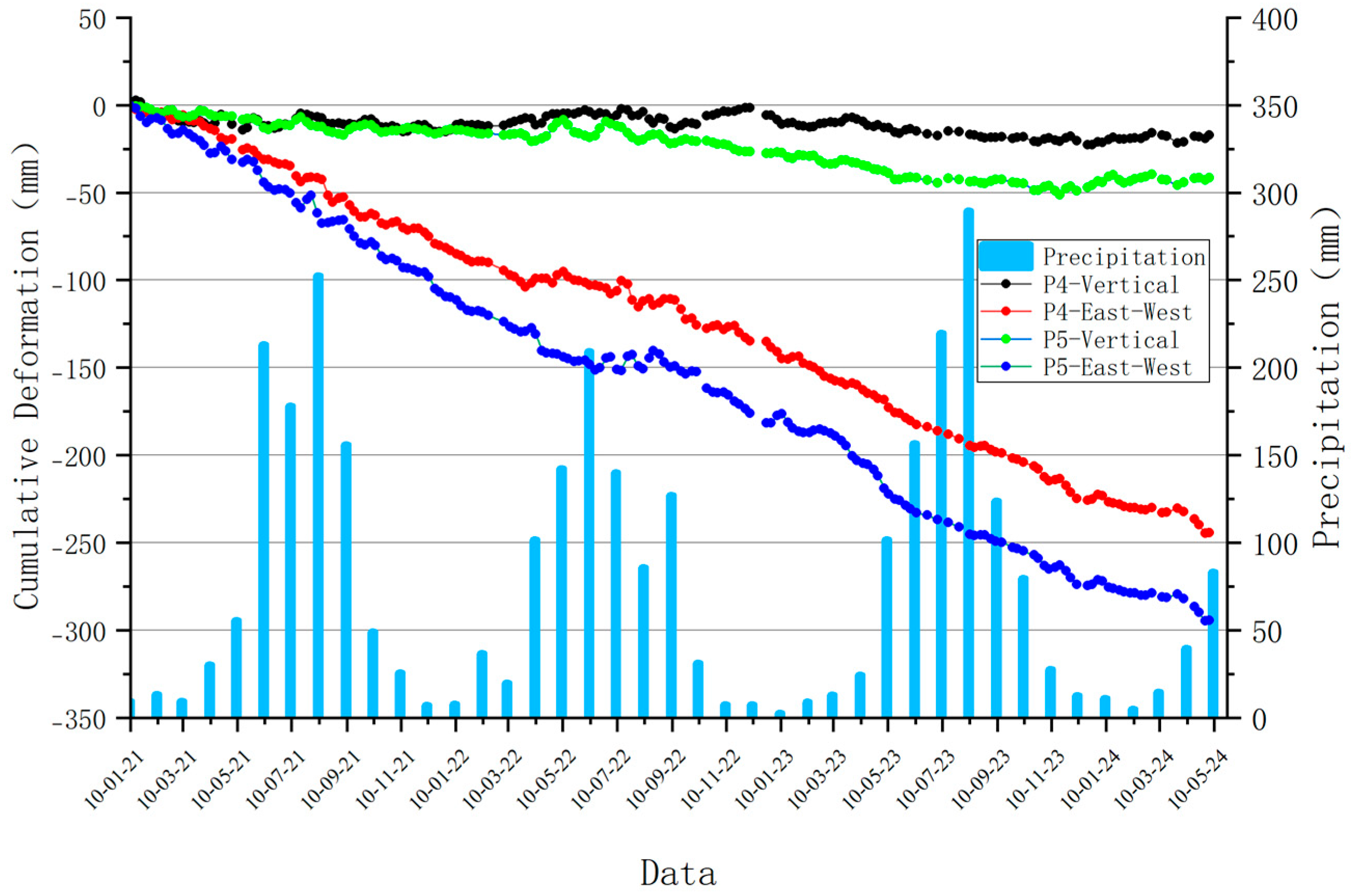 - Surveillance data from two selected typical deformation zones indicate that reservoir water level fluctuation is one of the primary triggering factors for landslide development and deformation in the reservoir area. In future work, integrating in situ monitoring data with numerical simulations—such as hydro-mechanical coupled models—would enable more rigorous quantitative analysis of landslide deformation mechanisms. Furthermore, incorporating advanced machine learning approaches, such as deep learning algorithms, could enhance the predictive capability of landslide behavior under varying reservoir operation schedules and rainfall scenarios.