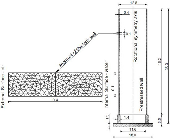 Vertical cross-section of the cylindrical prestressed water tank (dimensions in m) and a segment of the tank wall (with FE mesh) used as the 2D model in CFD simulations.