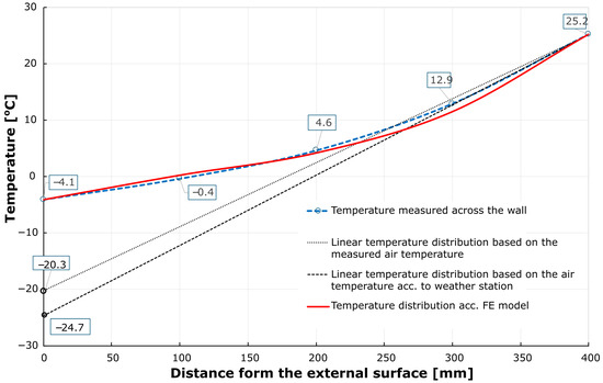 Temperature distribution across the wall thickness at the minimum air temperature (sampling time 65,400 s).