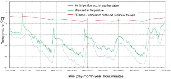 Air temperature recorded in a period of 5 days in winter 2010 (reproduced with the permission of the author [26]), along with the results from the FE transient heat transfer model.